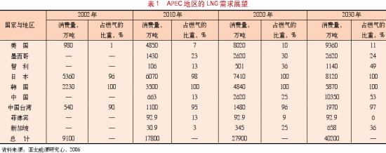 亚太地区LNG需求潜力巨大(见表1),但是这种潜力受到基础设施建设、LNG价格、居民收入以及发电和工业领域需求等因素的影响。例如,最近美国调低了LNG的需求预测值,部分主要买家对签订LNG长期合同持犹豫观望的态度。